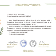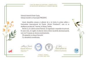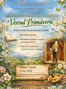 07 martie 2026– Invitație la Festivalul Internațional de Poezie „Versul Primării” ce va avea loc la Vârșeț, Serbia din partea Casei de Presă și Editură „Libertatea” și Asociația Mondială a Scriitorului.
