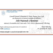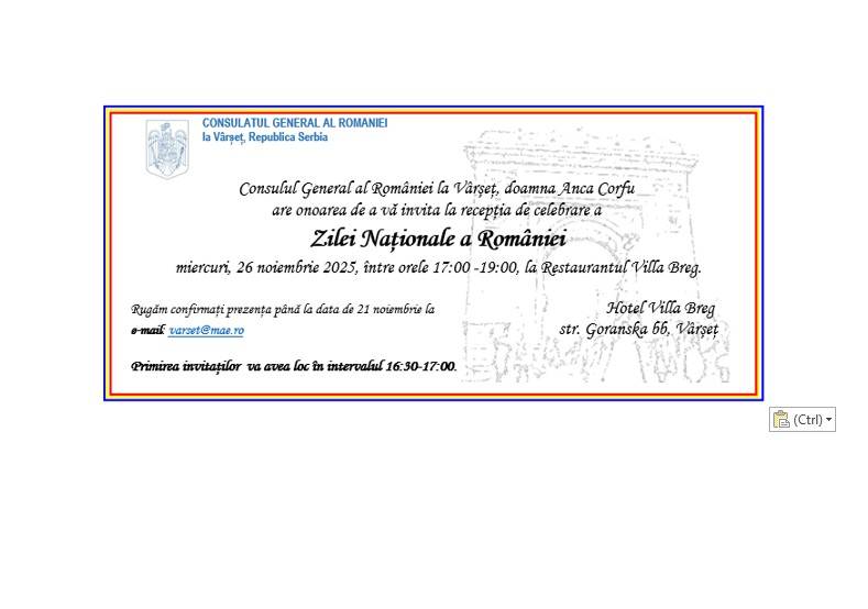 Invitație din partea Consulului General al României din Vârșeț, Serbia, Doamna Anca Corfu, pentru participarea la celebrarea Zilei Naționale a României.